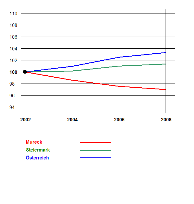 Zwischen 2002 und 2008 ist die Bevölkerungszahl (laut Zentralem Melderegister) im Bezirk Mureck um weitere 3,0% zurückgegangen (Steiermark: +1,3%, Österreich: +3,3%).