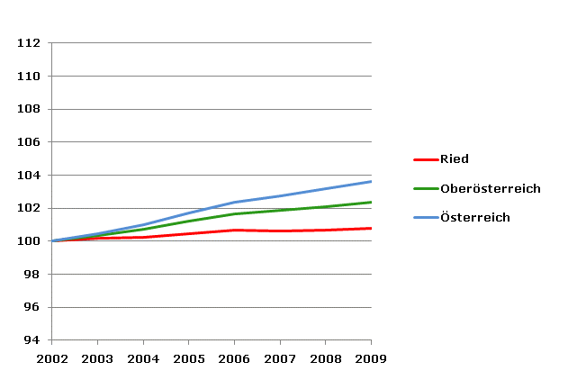 Zwischen 2002 und 2009 ist die Bevölkerungszahl (Bevölkerungsregister) im Bezirk Ried um weitere 0,8% gestiegen (Oberösterreich: +2,4%, Österreich: +3,6%).
