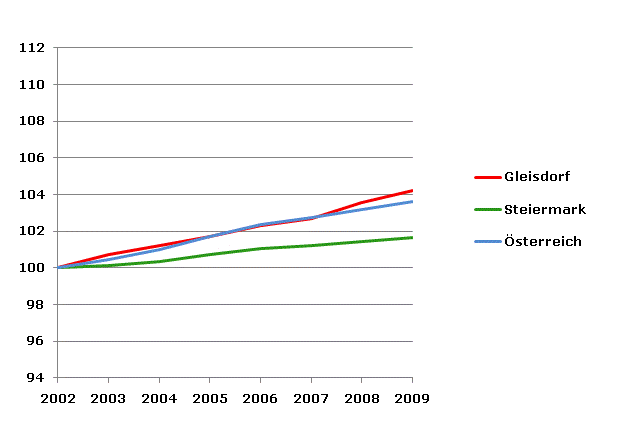 Zwischen 2002 und 2009 ist die Bevölkerungszahl (Bevölkerungsregister) im Bezirk Gleisdorf um weitere 4,2% gestiegen (Steiermark: +1,6%, Österreich: +3,6%).