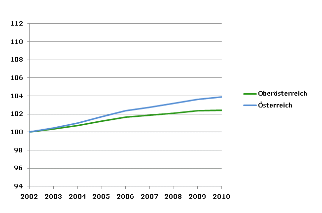 Zwischen 2002 und 2010 ist die Bevölkerungszahl (laut Bevölkerungsregister) in Oberösterreich um weitere 2,4% gestiegen (Österreich: +3,9%).