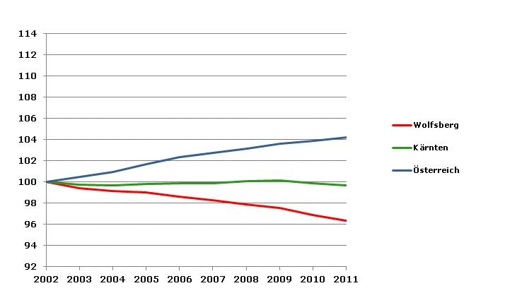 Die positive Entwicklung hat sich nach 2001 nicht fortgesetzt. Zwischen 2002 und 2011 ist die Bevölkerungszahl (Bevölkerungsregister) im Bezirk Wolfsberg um 3,7% zurückgegangen (Kärnten: -0,3%, Österreich: +4,2%).