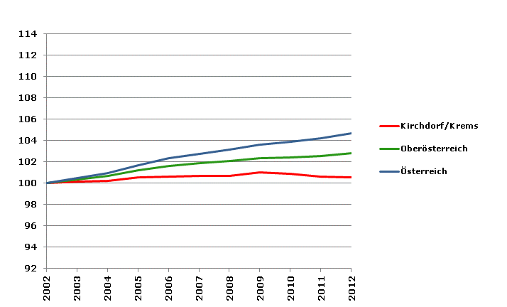 Die positive Entwicklung hat sich nach 2001 nur sehr abgeschwächt fortgesetzt. Zwischen 2002 und 2012 ist die Bevölkerungszahl (Statistik des Bevölkerungsstandes) im Bezirk Kirchdorf/Krems um weitere 0,6% gestiegen (Oberösterreich: +2,8%, Österreich: +4,7%).