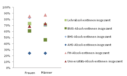 Der Anteil der 25-64-jährigen Frauen mit einem der genannten Hochschul- oder hochschulverwandten Abschlüsse lag im Jahr 2010 mit 23,3% über jenem der Männer (21,4%), 17,9% der Frauen dieser Altersgruppe hatten Matura (Männer: 18,3%).