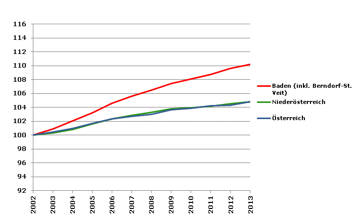 Die positive Entwicklung hat sich auch nach 2001 fortgesetzt. Zwischen 2002 und 2013 ist die Bevölkerungszahl (Statistik des Bevölkerungsstandes) im Bezirk Baden (inkl. Berndorf-St. Veit) um weitere 10,2% gestiegen (Niederösterreich: +4,8%, Österreich: +4,8%).