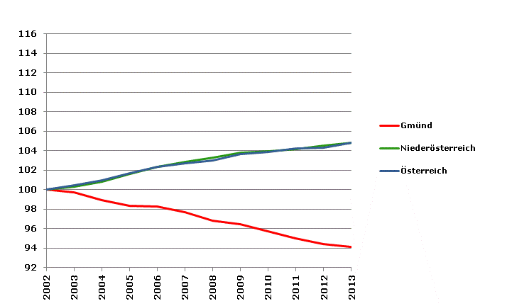 Die negative Entwicklung hat sich auch nach 2001 fortgesetzt. Zwischen 2002 und 2013 ist die Bevölkerungszahl (Statistik des Bevölkerungsstandes) im Bezirk Gmünd um weitere 5,9% zurückgegangen (Niederösterreich: +4,8%, Österreich: +4,8%).