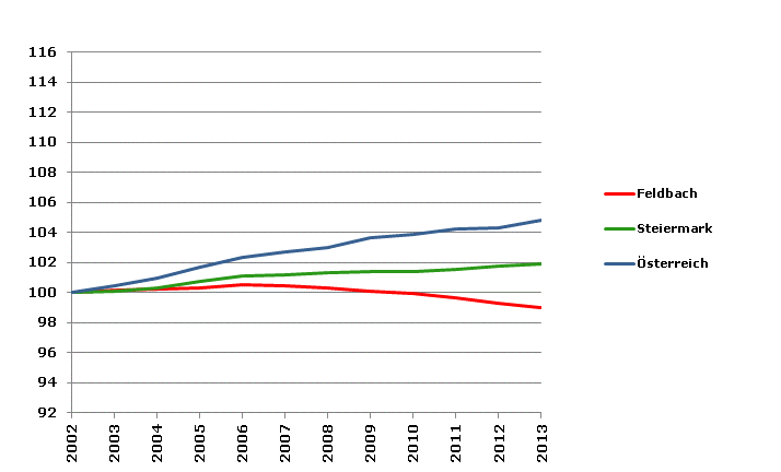 Die positive Entwicklung hat sich nach 2001 nicht fortgesetzt. Zwischen 2002 und 2013 ist die Bevölkerungszahl (Statistik des Bevölkerungsstandes) im Bezirk Feldbach um 1,0% zurückgegangen (Steiermark: +1,9%, Österreich: +4,8%).
