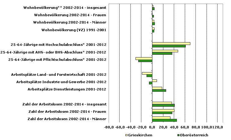 Arbeitszentren des Bezirkes sind vor allem der Bezirkshauptort Grieskirchen sowie die Gemeinden Bad Schallerbach, Gaspoltshofen, Peuerbach, Haag am Hausruck und Schlüßlberg, wo 50% der Arbeitsplätze des Arbeitsmarktbezirkes sind. Als Wohnzentrum ist noch die Gemeinde Waizenkirchen zu nennen.