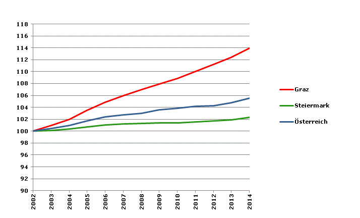 Die positive Entwicklung hat sich auch nach 2001 fortgesetzt. Zwischen 2002 und 2014 ist die Bevölkerungszahl (Statistik des Bevölkerungsstandes) im Bezirk Graz um weitere 14,0% gestiegen (Steiermark: +2,3%, Österreich: +5,5%).