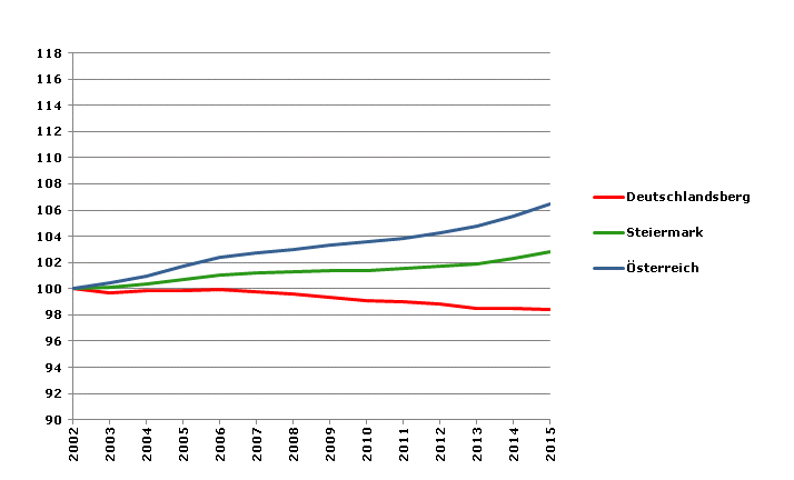 Die positive Entwicklung hat sich nach 2001 nicht fortgesetzt. Zwischen 2002 und 2015 ist die Bevölkerungszahl (Statistik des Bevölkerungsstandes) im Bezirk Deutschlandsberg um 1,6% zurückgegangen (Steiermark: +2,8%, Österreich: +6,5%).