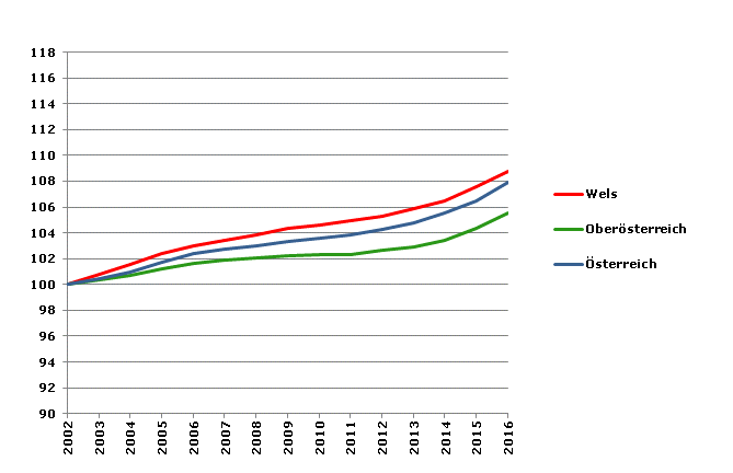 Die positive Entwicklung hat sich auch nach 2001 fortgesetzt. Zwischen 2002 und 2016 ist die Bevölkerungszahl (Statistik des Bevölkerungsstandes) im Bezirk Wels um weitere 8,8% gestiegen (Oberösterreich: +5,5%, Österreich: +7,9%).