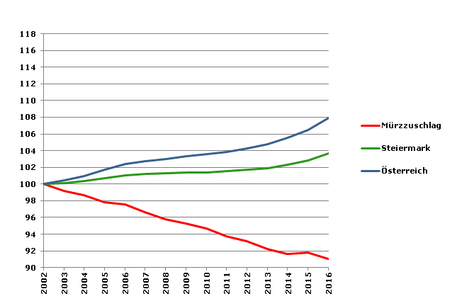 Die negative Entwicklung hat sich auch nach 2001 fortgesetzt. Zwischen 2002 und 2016 ist die Bevölkerungszahl (Statistik des Bevölkerungsstandes) im Bezirk Mürzzuschlag um weitere 9,0% zurückgegangen (Steiermark: +3,7%, Österreich: +7,9%).