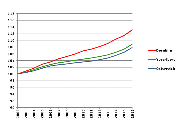 Die positive Entwicklung hat sich auch nach 2001 fortgesetzt. Zwischen 2002 und 2016 ist die Bevölkerungszahl (Statistik des Bevölkerungsstandes) im Bezirk Dornbirn um weitere 13,2% gestiegen (Vorarlberg: +9,0%, Österreich: +7,9%).