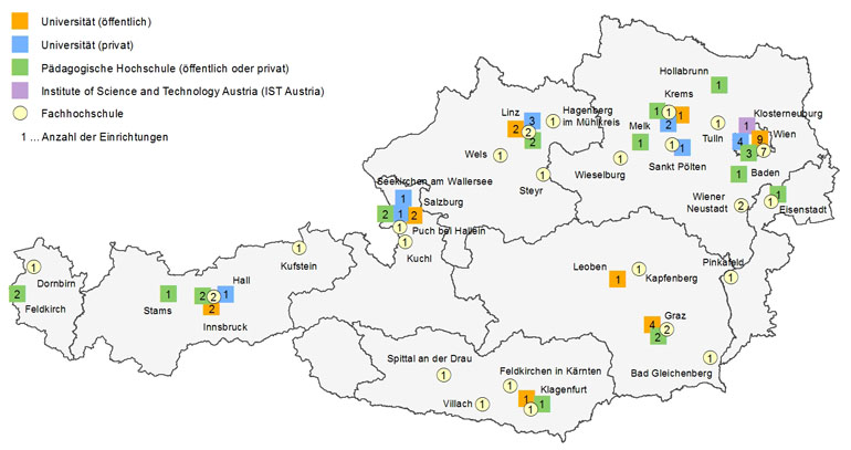 In Österreich gibt es mit Wien, Graz, Leoben, Innsbruck, Salzburg, Linz, Klagenfurt und Krems acht Standorte öffentlicher Universitäten.