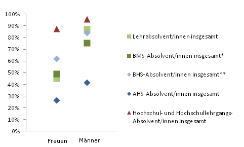 Für einen Großteil der Frauen und Männer (89% bzw. 86%) ist der AHS-Abschluss nur ein Zwischenschritt in der Ausbildungskarriere, nur sehr wenige Personen (5%) machen hingegen nach dem Lehrabschluss eine weitere Ausbildung.