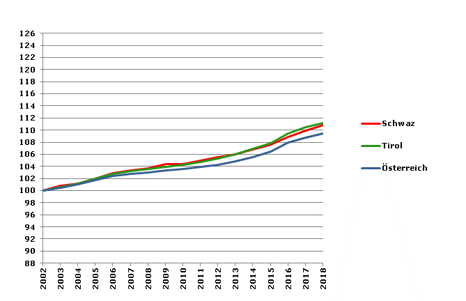 Die positive Entwicklung hat sich auch nach 2001 fortgesetzt. Zwischen 2002 und 2018 ist die Bevölkerungszahl (Statistik des Bevölkerungsstandes) im Bezirk Schwaz um weitere 10,8% gestiegen (Tirol: +11,2%, Österreich: +9,4%).