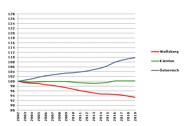 Die positive Entwicklung hat sich nach 2001 nicht fortgesetzt. Zwischen 2002 und 2019 ist die Bevölkerungszahl (Statistik des Bevölkerungsstandes) im Bezirk Wolfsberg um 6,6% zurückgegangen (Kärnten: +0,2%, Österreich: +9,9%).