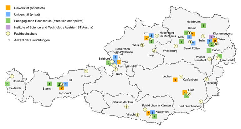 In Österreich gibt es mit Wien, Graz, Leoben, Innsbruck, Salzburg, Linz, Klagenfurt und Krems acht Standorte öffentlicher Universitäten.