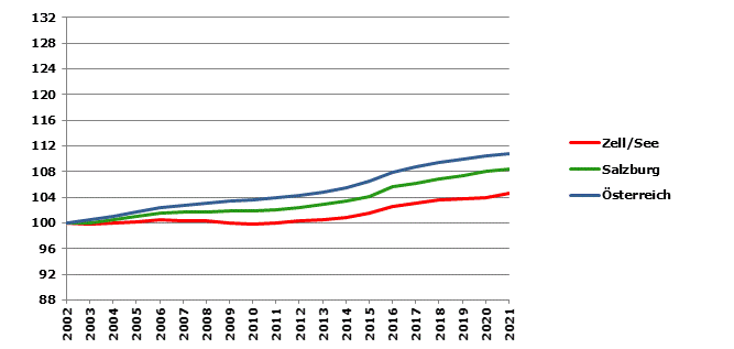 Zwischen 2002 und 2021 ist die Bevölkerungszahl (Statistik des Bevölkerungsstandes) im Bezirk Zell/See um 4,6% gestiegen (Salzburg: +8,4%, Österreich: +10,8%).