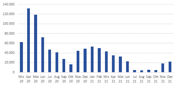 Bestand der Personen in Kurzarbeit (März 2020 bis Dezember 2021)