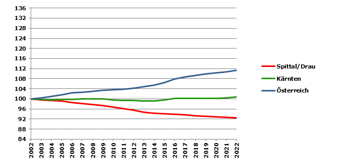 Zwischen 2002 und 2022 ist die Bevölkerungszahl (Statistik des Bevölkerungsstandes) im Bezirk Spittal/Drau um 7,5% zurückgegangen (Kärnten: +0,8%, Österreich: +11,4%).