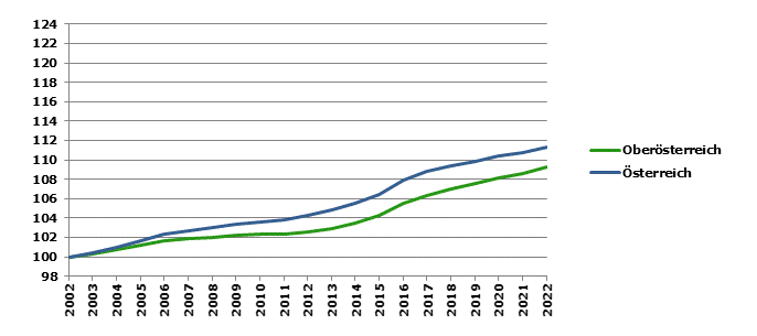 Zwischen 2002 und 2022 ist die Bevölkerungszahl (laut Statistik des Bevölkerungsstandes) in Oberösterreich um 9,2% gestiegen (Österreich: +11,4%).Oberösterreich weist seit 2002 durchwegs positive Geburtenbilanzen auf (Ausnahme: 2020), auch die Wanderungssalden waren fast durchwegs positiv (Ausnahmen: 2009 und 2010). Die Veränderung der Wohnbevölkerung durch Wanderungsbewegungen betrug in Oberösterreich seit 2002 rund +7,2%. Die Veränderung durch Binnenwanderung (Wohnsitzwechsel innerhalb Österreichs) war dabei mit -2,7% negativ. Die Veränderung durch Außenwanderung (Wanderungsbewegungen über die Staatsgrenze) betrug +9,9%.