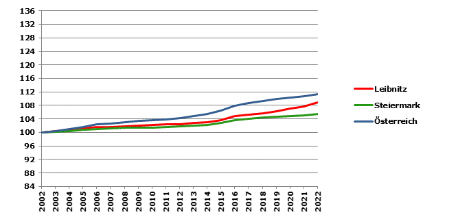 Zwischen 2002 und 2022 ist die Bevölkerungszahl (Statistik des Bevölkerungsstandes) im Bezirk Leibnitz um 8,9% gestiegen (Steiermark: +5,5%, Österreich: +11,4%).