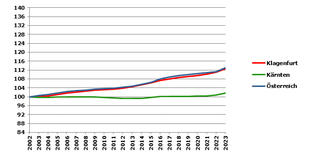 Zwischen 2002 und 2023 ist die Bevölkerungszahl (Statistik des Bevölkerungsstandes) im Bezirk Klagenfurt um 12,5% gestiegen (Kärnten: +1,6%, Österreich: +12,9%).