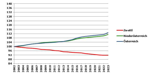 Zwischen 2002 und 2023 ist die Bevölkerungszahl (Statistik des Bevölkerungsstandes) im Bezirk Zwettl um 8,1% zurückgegangen (Niederösterreich: +11,3%, Österreich: +12,9%).