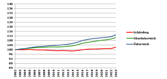 Zwischen 2002 und 2023 ist die Bevölkerungszahl (Statistik des Bevölkerungsstandes) im Bezirk Schärding um 2,0% gestiegen (Oberösterreich: +10,5%, Österreich: +12,9%).