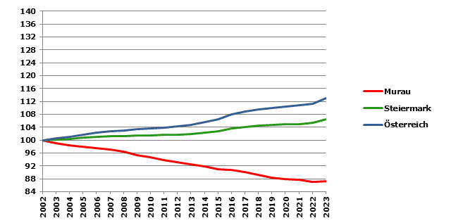 Zwischen 2002 und 2023 ist die Bevölkerungszahl (Statistik des Bevölkerungsstandes) im Bezirk Murau um 12,7% zurückgegangen (Steiermark: +6,5%, Österreich: +12,9%).